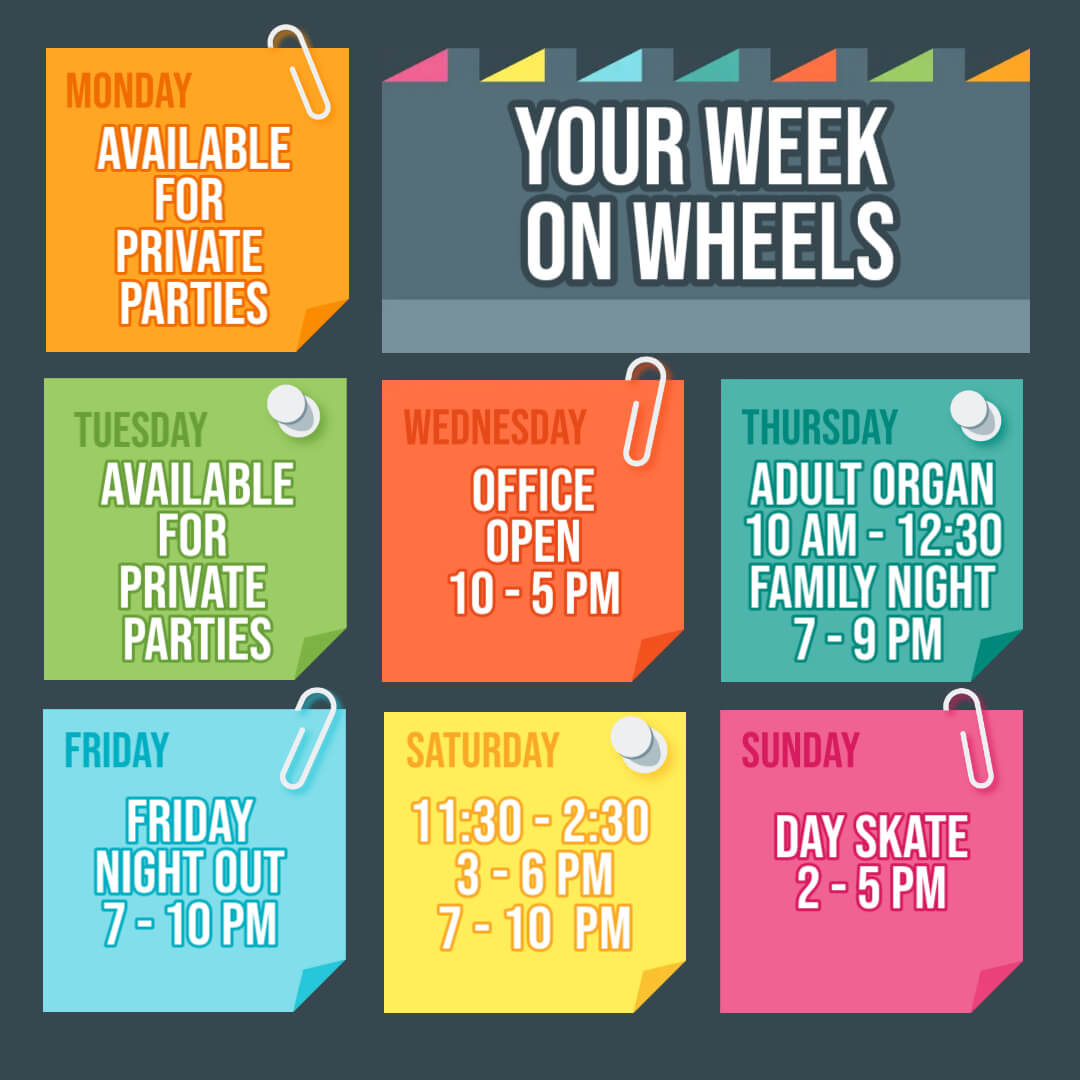 All Skaters Skate at Your Own Risk. FL St. 768.39 It is the nature of skating to sometimes fall or have someone run into you, if you do not want to accept that risk, please do not skate here. We do not have Insurance to cover accidents. All Rules posted in Lobby. All Prices Shown include Sales Tax. Hours and Prices Subject to change.